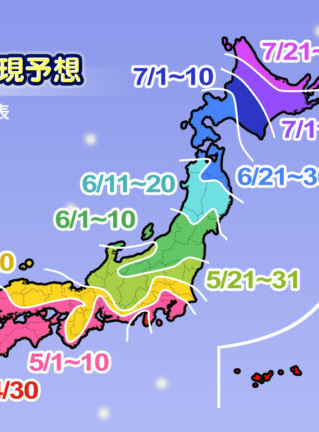 | 宮城県 | 6月4日頃 | 6月17日頃 | 6月9日頃 | 6月16日頃 | 6月8日頃 | 6月21日頃 |