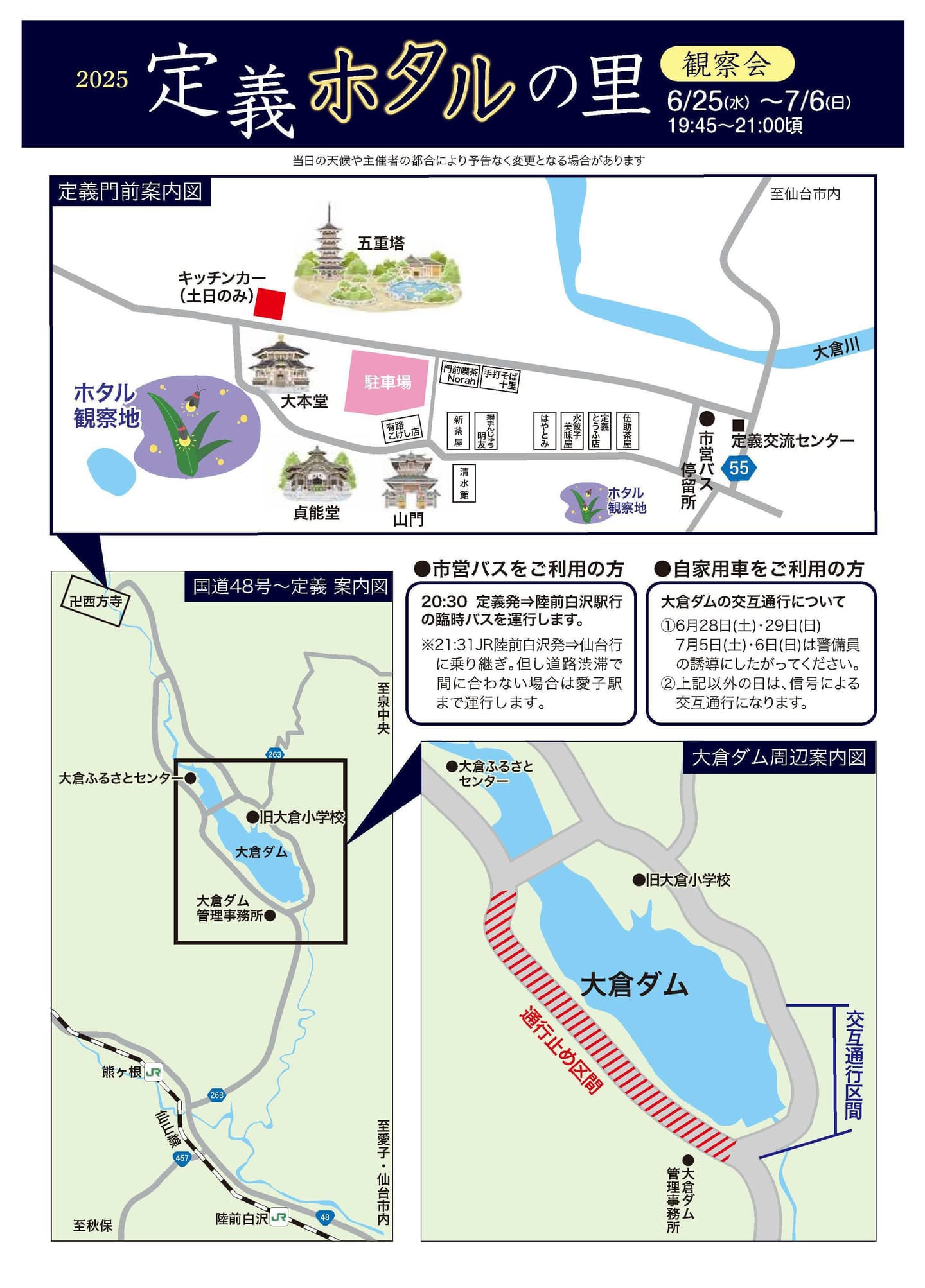 大倉四季探検定義ホタル祭り実行委員会は、定義観光協会、定義町内会と共催で定義ホタル鑑賞会を下記の通り開催します。