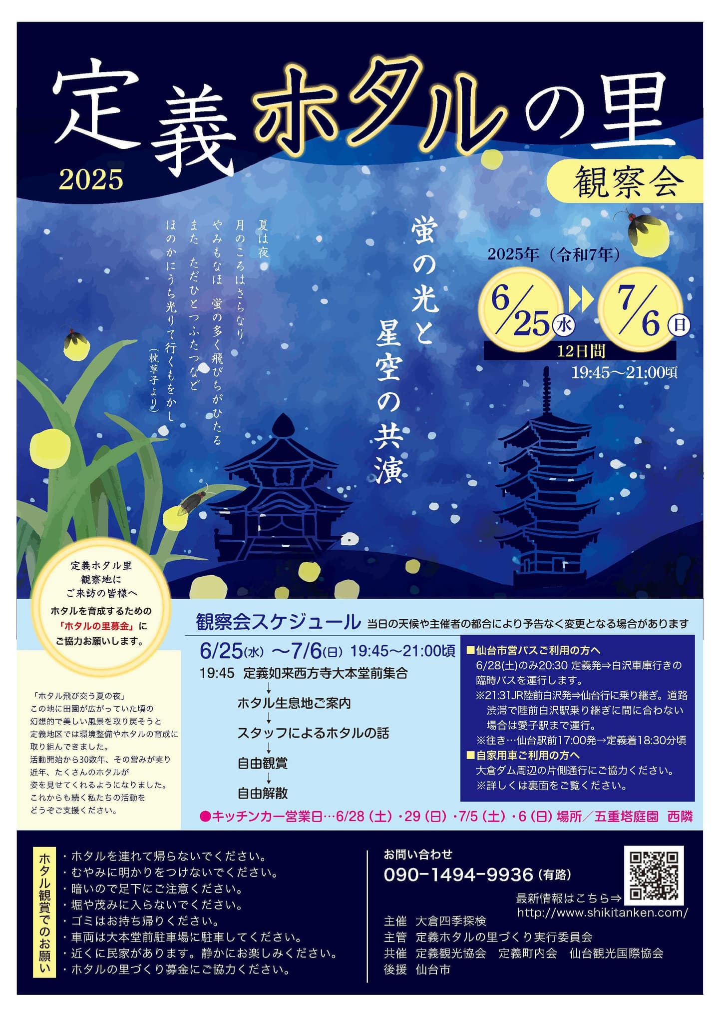 数十年ぶりに、定義門前をホタルが優雅に飛び交い、翌年には、その小さな命が育ち、光の舞はさらに豊かに夜を彩りました。 今、「定義ホタルの里づくり実行委員会」では、この美しい再生の物語を、より多くの方と分かち合うために、ホタル鑑賞会を開催いたします。