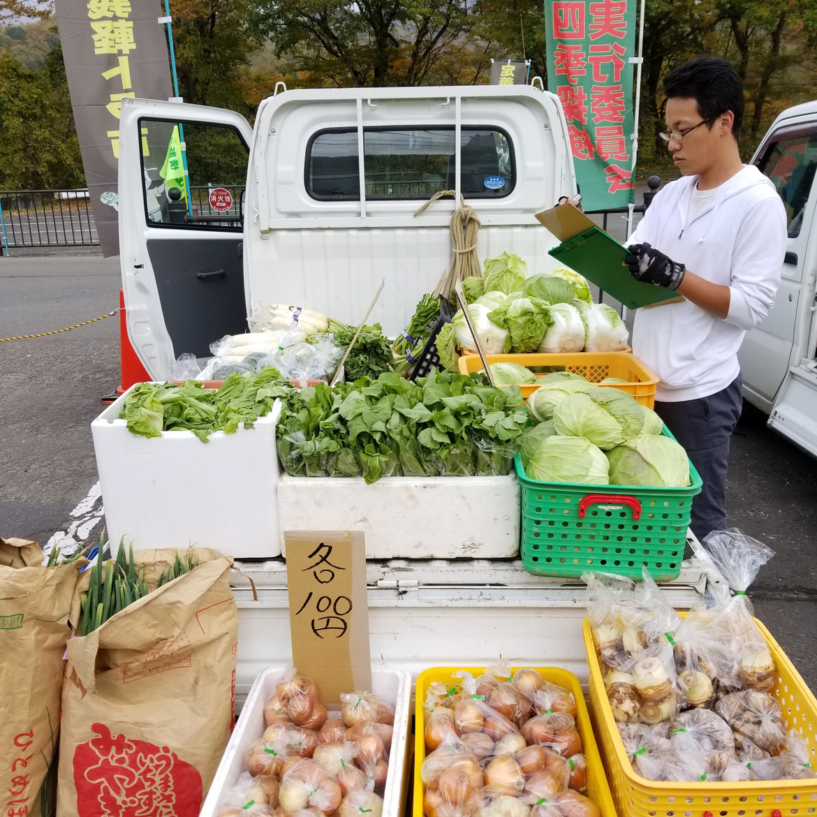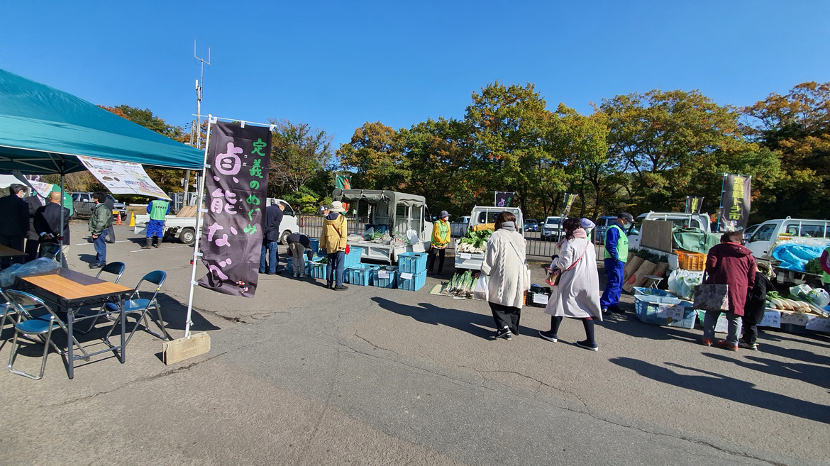 このイベントは、大倉地場産品市実行委員会、定義観光協会と協同で、定義門前の名産、地域の農産物、キノコ類など地元で収穫された新鮮野菜などを軽トラックの荷台で販売する地場産品市です。